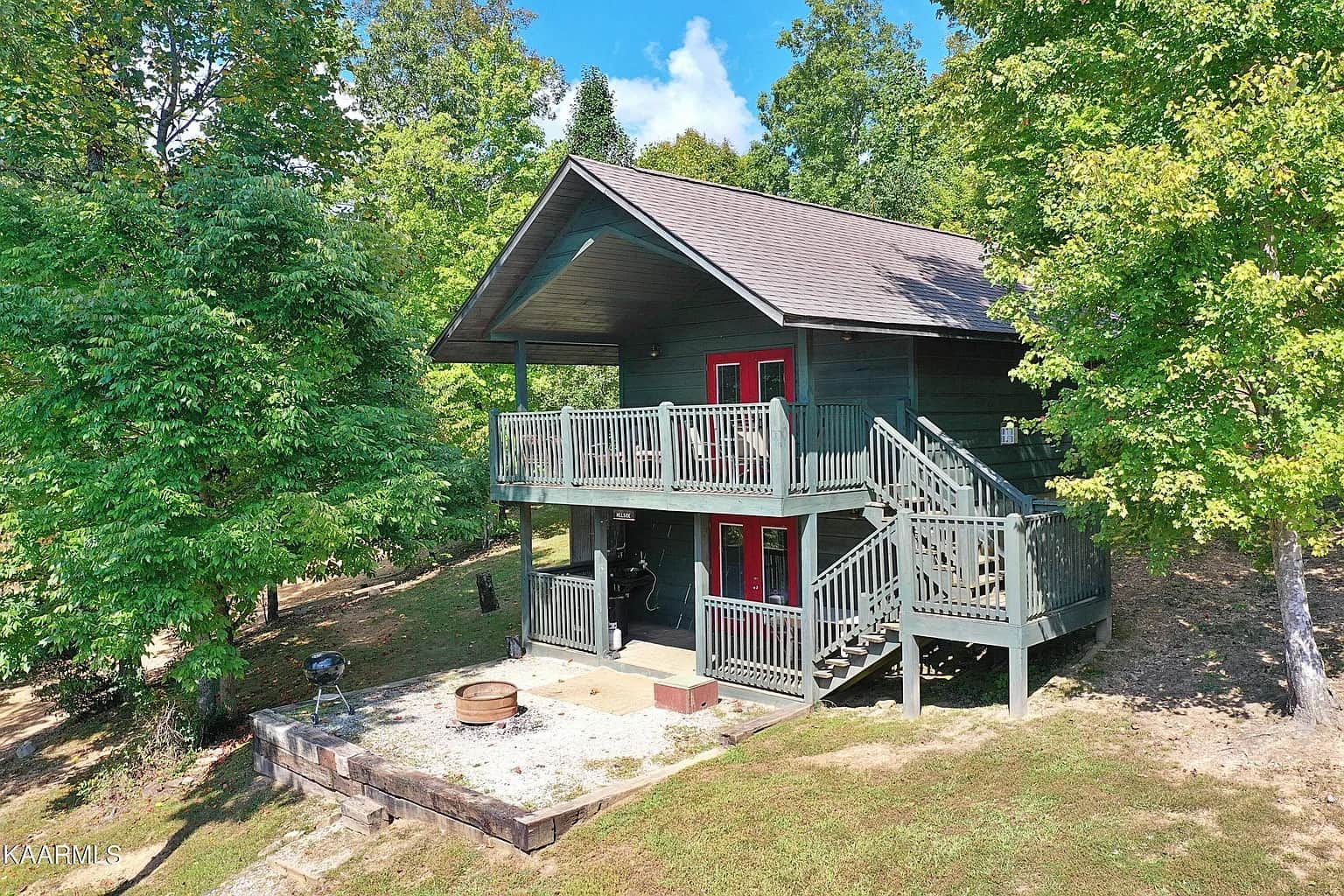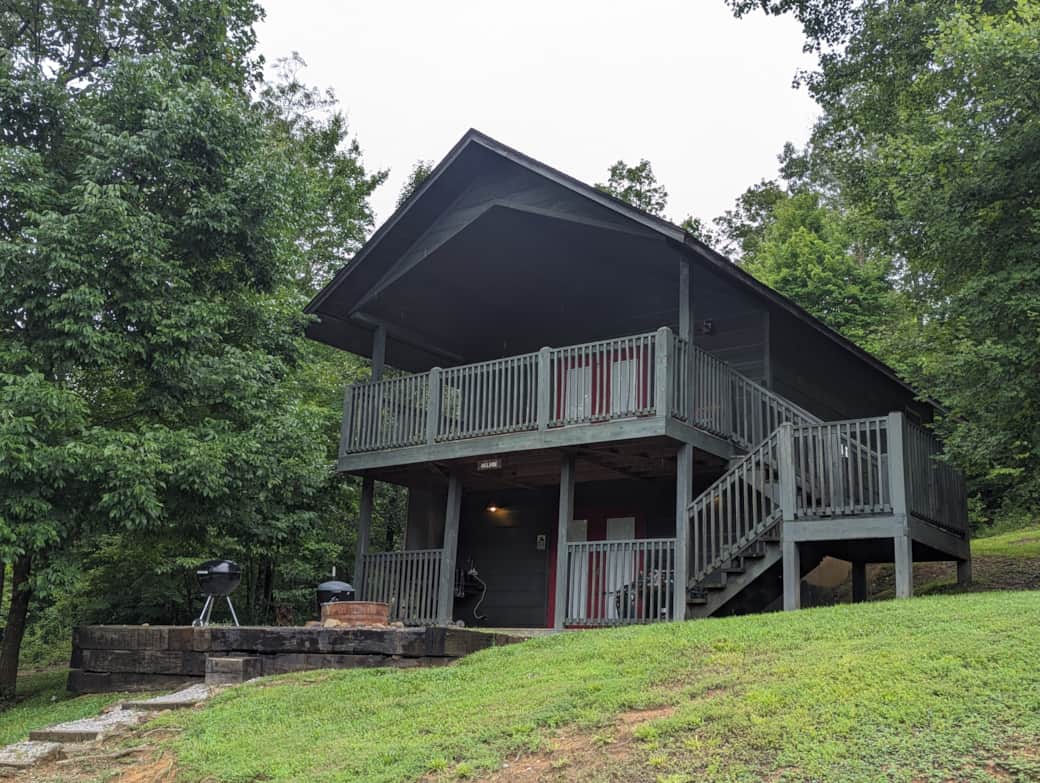 The ground level includes 1 queen, 1 full, and 2 twin beds. This space opens to a gathering area with a gas grill and fire pit, which is perfect for stargazing and drinks with friends.